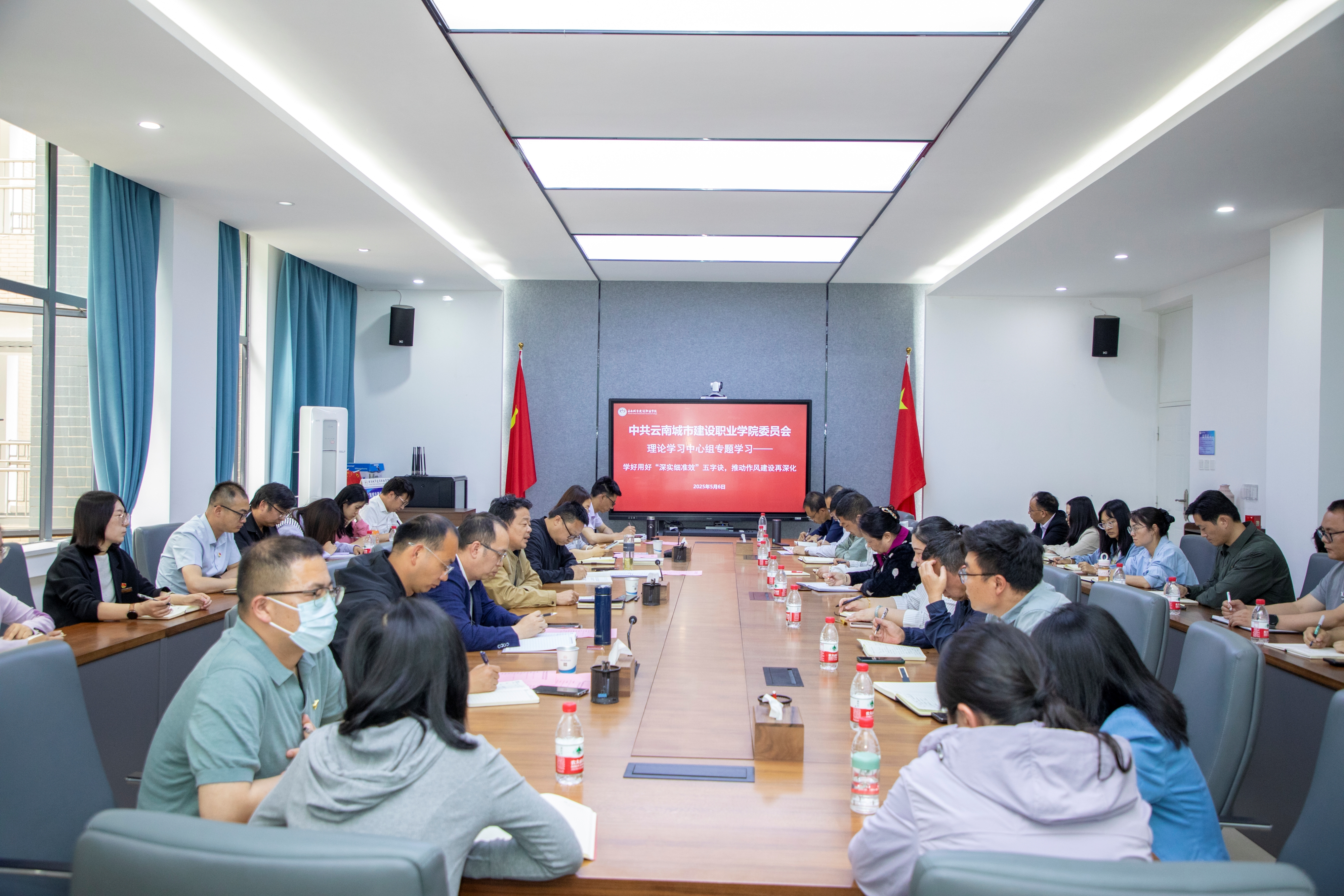 5月6日下午,云南城市建设职业学院在教学楼214会议室举行党委理论学习中心组学习,专题学习习近平总书记关于加强党的作风建设的重要论述的相关内容,并开展警示教育,持续推进学校深入贯彻中央八项规定精神学习教育。学校党委书记郭云龙主持会议并讲话,学校党政领导、全体中层干部、党委各部负责人、各党支部支委、党务专干参加学习。
