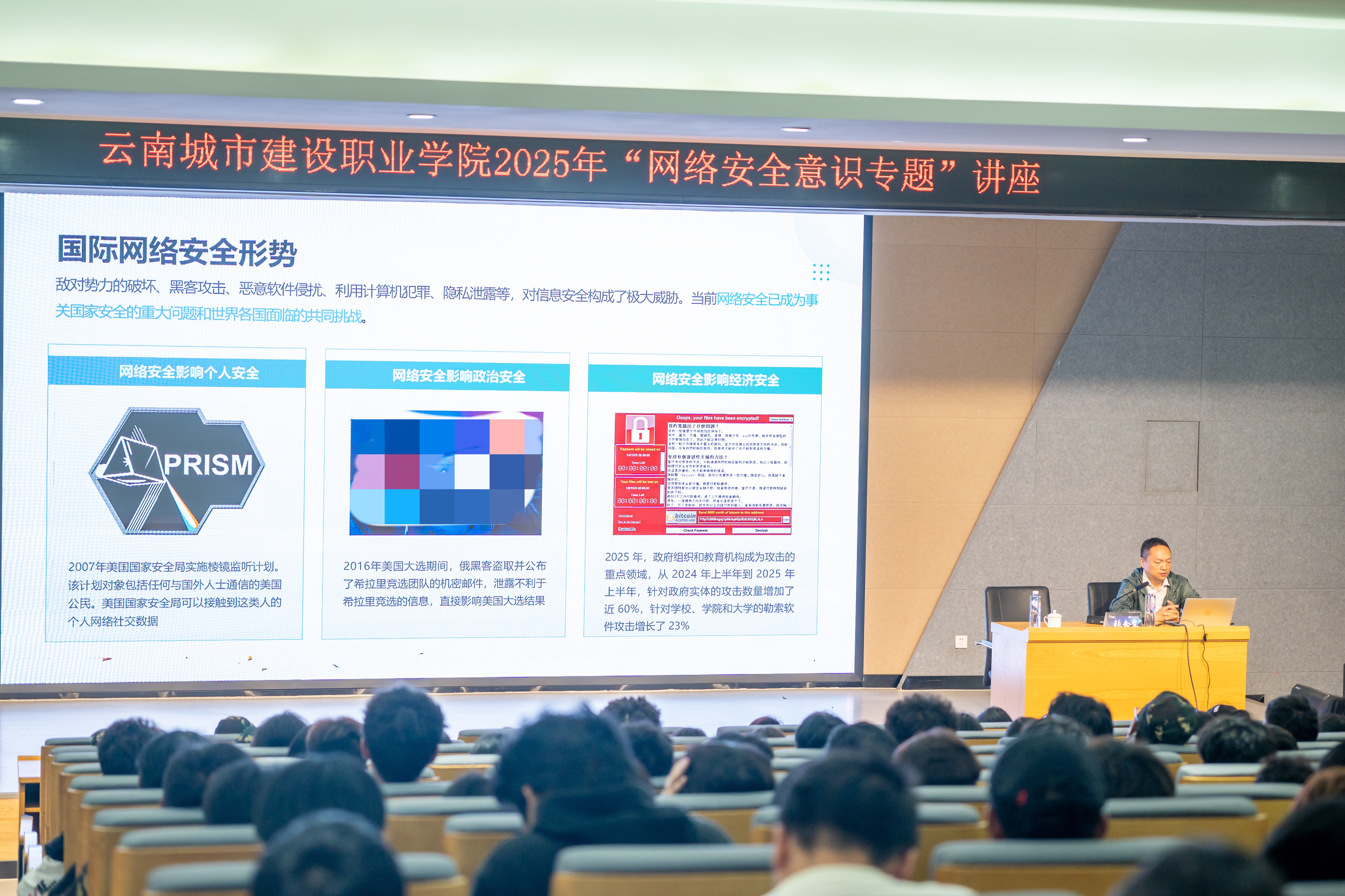 为提升全校师生网络安全意识,筑牢校园网络安全防线,近日,云南城市建设职业学院在115报告厅举办网络安全意识专题讲座,学校相关部门负责人、各二级学院师生代表共计200余人参加。本次讲座由学校图文信息中心副主任赖文刚主持。