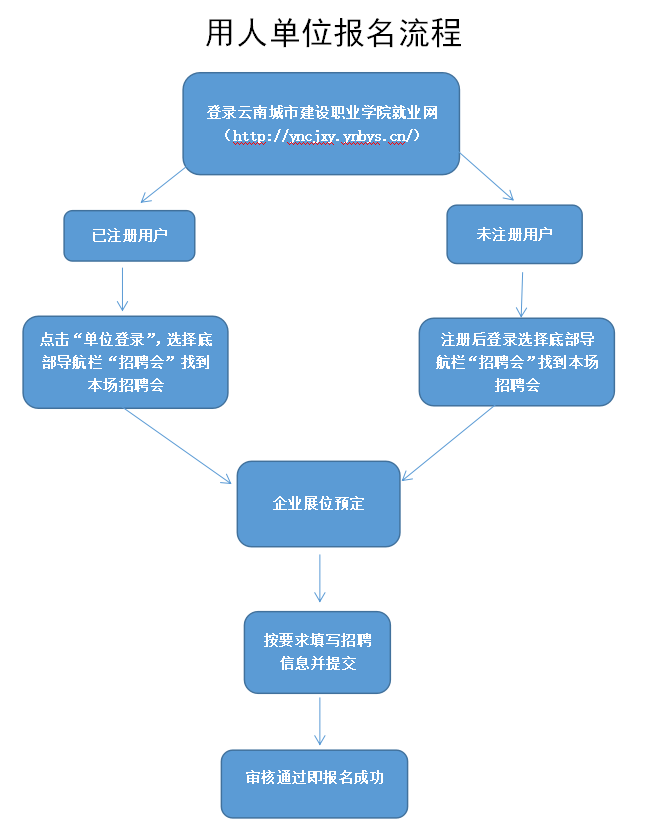 登陆“云南城市建设职业学院就业信息网”(http://yncjxy.ynbys.cn),点击“单位登录”预约招聘会。已注册的单位请直接登录系统,依次点击“招聘中心、预订招聘会展位、云南省2025届高职高综合类专场网络招聘会预订展位”进行预约。未注册的单位请先注册,经审核后登录预约(报名流程见下图)。