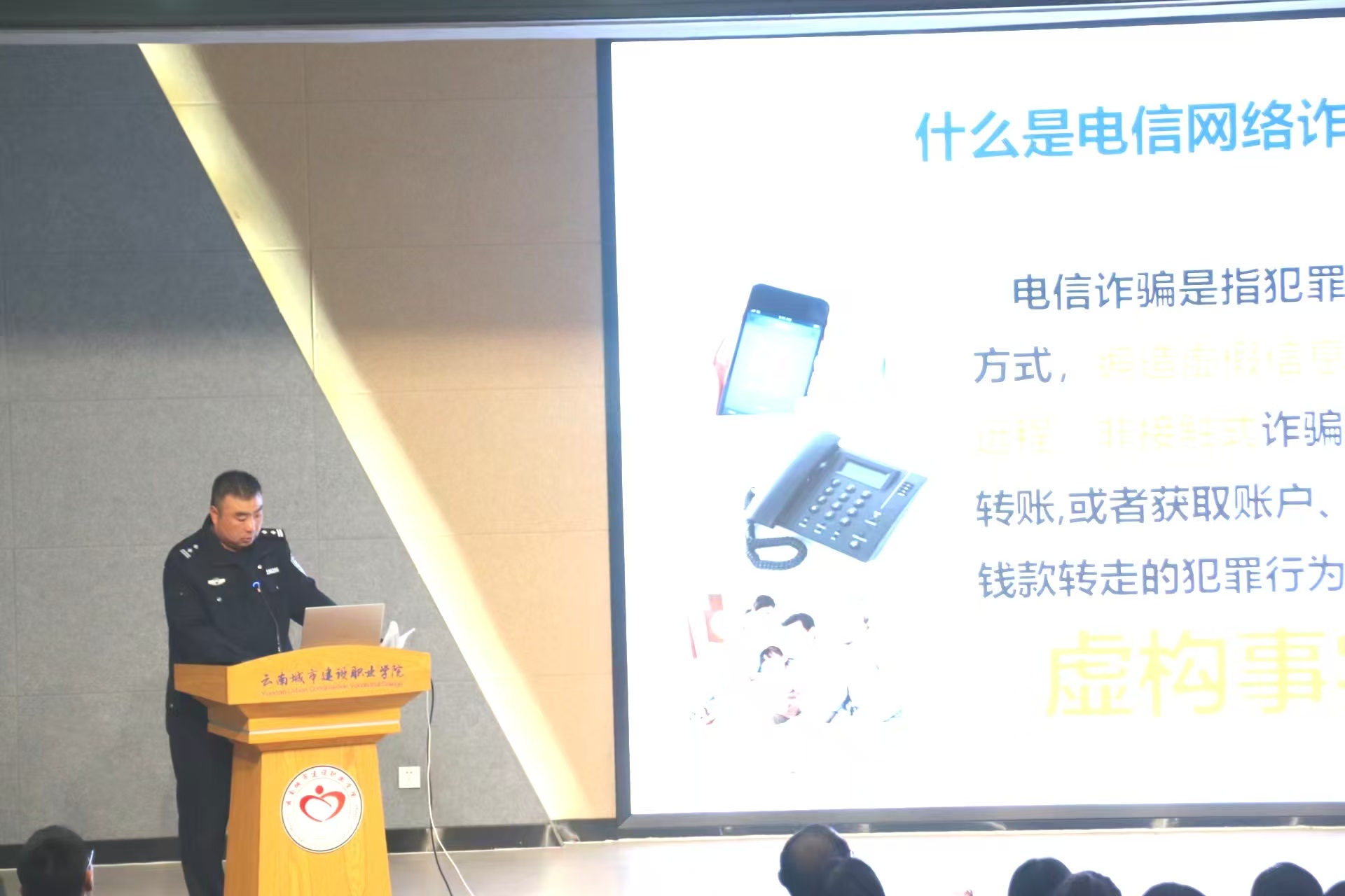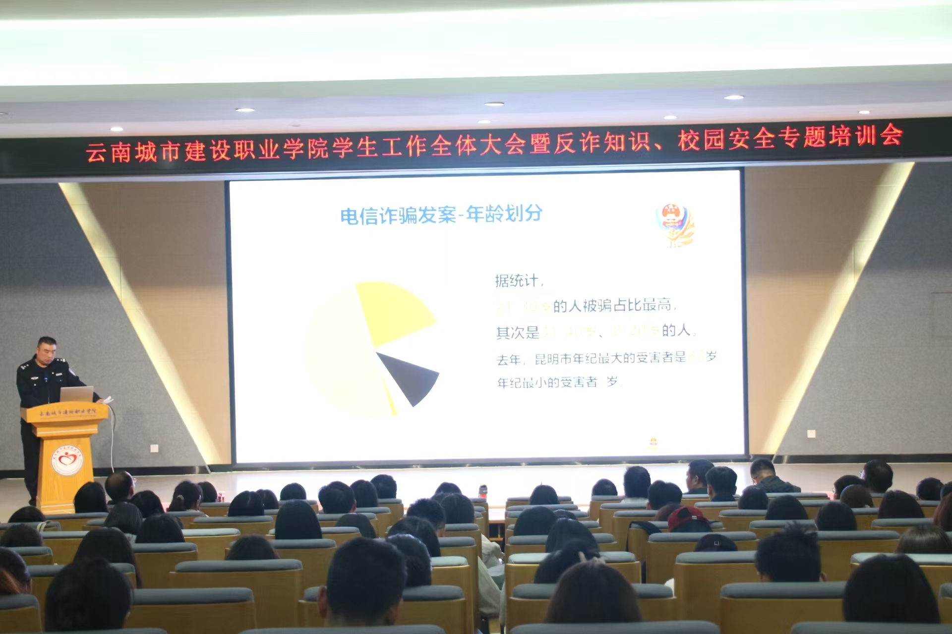 为加强师生识骗防骗意识和能力,有效遏制校园电信网络诈骗案件发生,近日,云城建在教学楼115报告厅开展反诈知识专题培训,学校党委副书记杨敏捷,学生工作处、校团委、保卫处、后勤管理处负责人,各二级学院学生工作负责人及全体辅导员(班主任)参加。