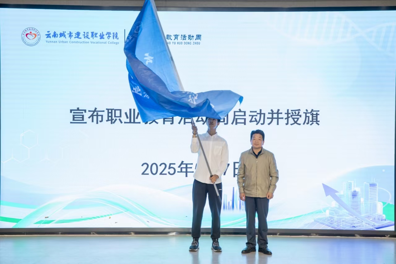 学校党委书记郭云龙宣布2025年职业教育活动周正式启动,并向学生代表授旗,全场气氛推向高潮。