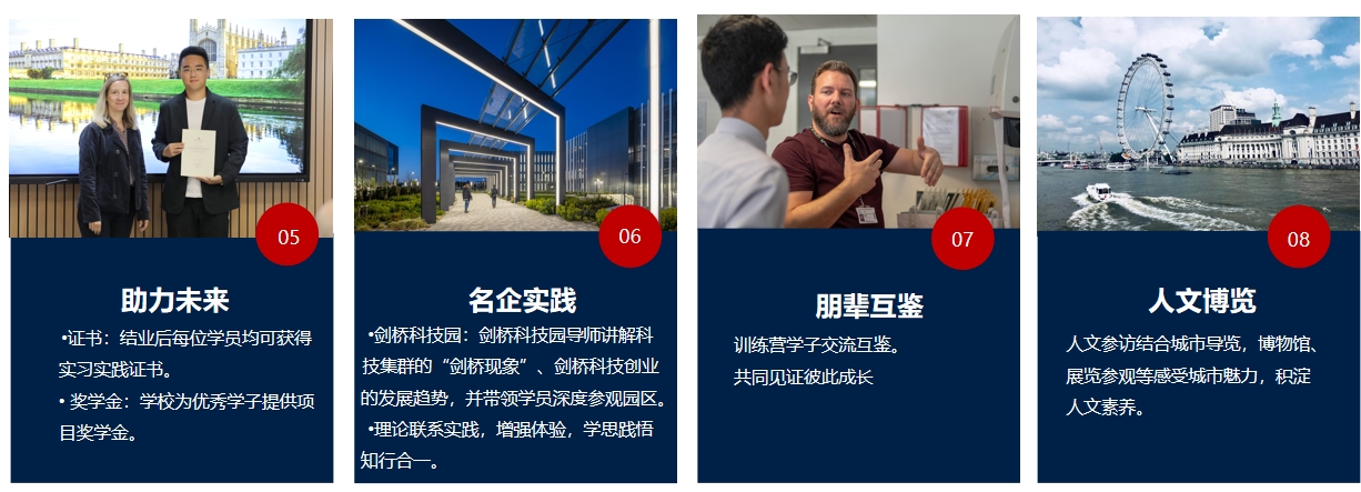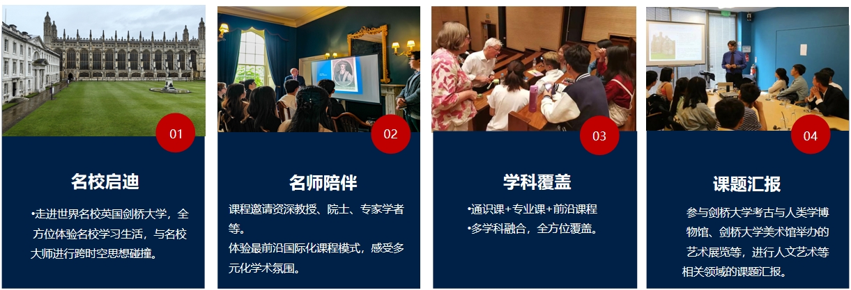 剑桥-青年榜样训练营为短期项目,总共14天,该项目走进英国剑桥大学,感受名校学风,徜徉学术殿堂,与名校大师进行跨时空思想碰撞,去体验最前沿国际化课程模式,感受多元化学术氛围,进行人文艺术等相关领域的课题汇报,开展名企实践和人文博览等活动,有助于开拓学生思维与国际视野,体验多元文化,帮助学生从容应对未来挑战。