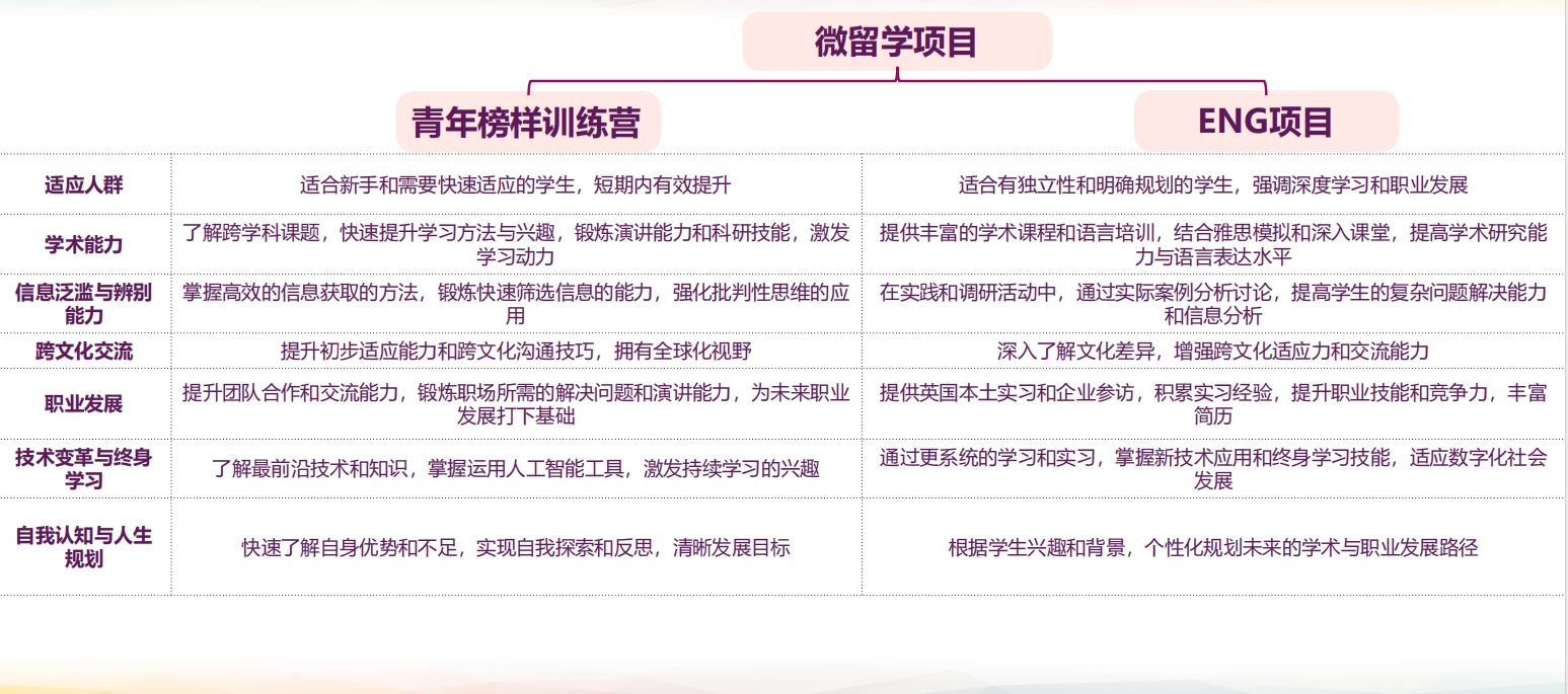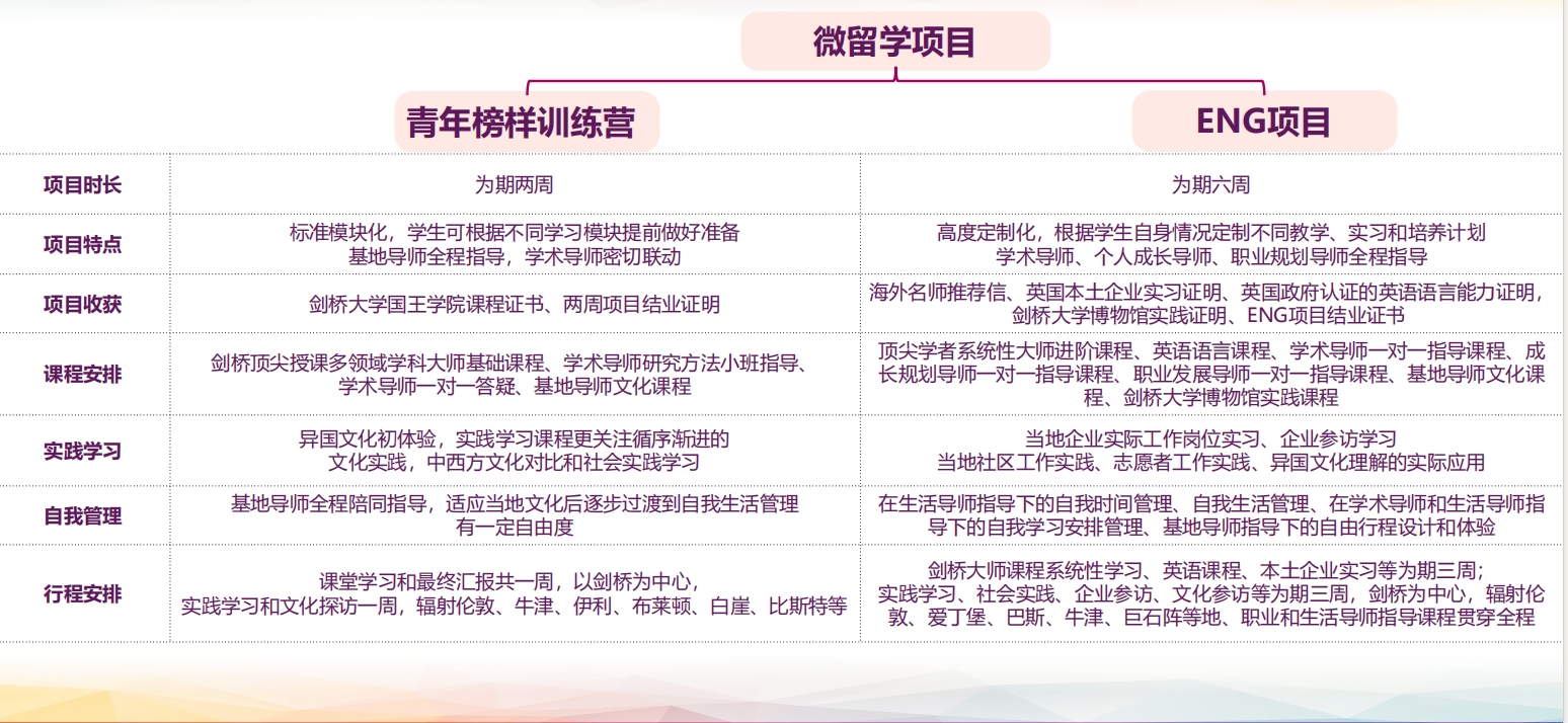 为进一步深入贯彻落实中共中央、国务院印发《教育强国建设规划纲要(2024—2035年)》中的“鼓励支持选拔优秀人才到国际知名高校、研究机构研修,扩大中外青少年交流,实施国际暑期学校等项目”的精神,学校坚持“高端化、全球化、个性化”的发展战略引领,全面提高国际化人才的培养层次,精心设计英国剑桥-青年榜样训练营和ENG项目,现在,让我们一起深入地了解这两个项目吧!