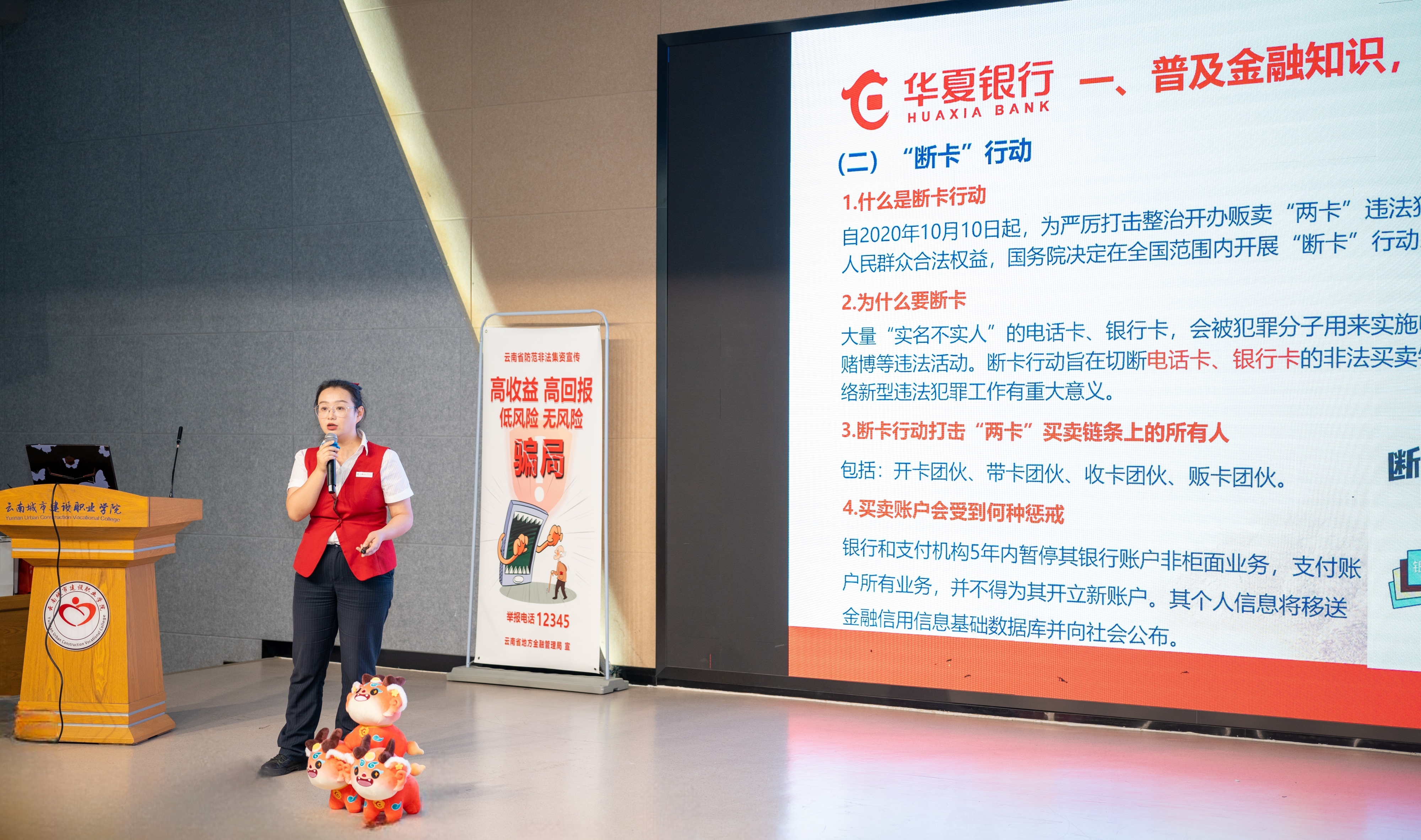 此次讲座邀请华夏银行昆明圆通支行客户经理李丹到校授课。李经理围绕金融安全,从“守住‘钱袋子’”的防骗要点、“断卡”行动、电信网络诈骗、非法集资和个人征信等方面,讲解了相关知识、惩戒措施、注意事项与法律责任等内容,并提醒师生理性投资、注意产品风险,做到“三看”“三不要”,进一步提升了现场师生防范金融安全的意识和能力。