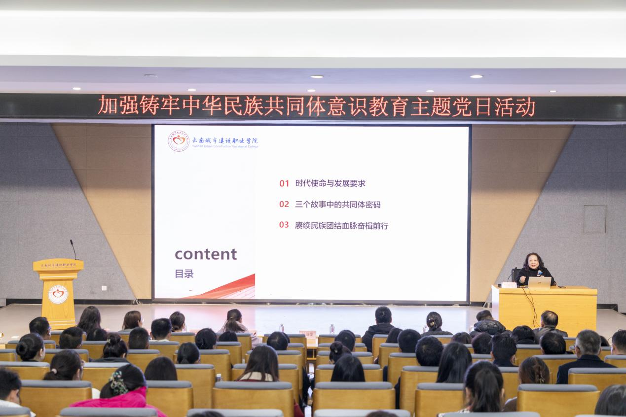 云南城市建设职业学院马克思主义学院院长姚常红教授以《汇聚职教新城奋进力量,加强铸牢中华民族共同体意识教育》为题,讲授专题党课。她结合云南“三个定位”战略指引,从历史维度、实践维度、时代维度,生动讲述了兰茂《滇南本草》的知识共享、民族团结誓词碑的“一心一德”、独龙江“七彩路”的脱贫奇迹等三个深刻体现中华民族共同体精神的故事,阐释了中华民族多元一体格局的历史脉络与现实意义。