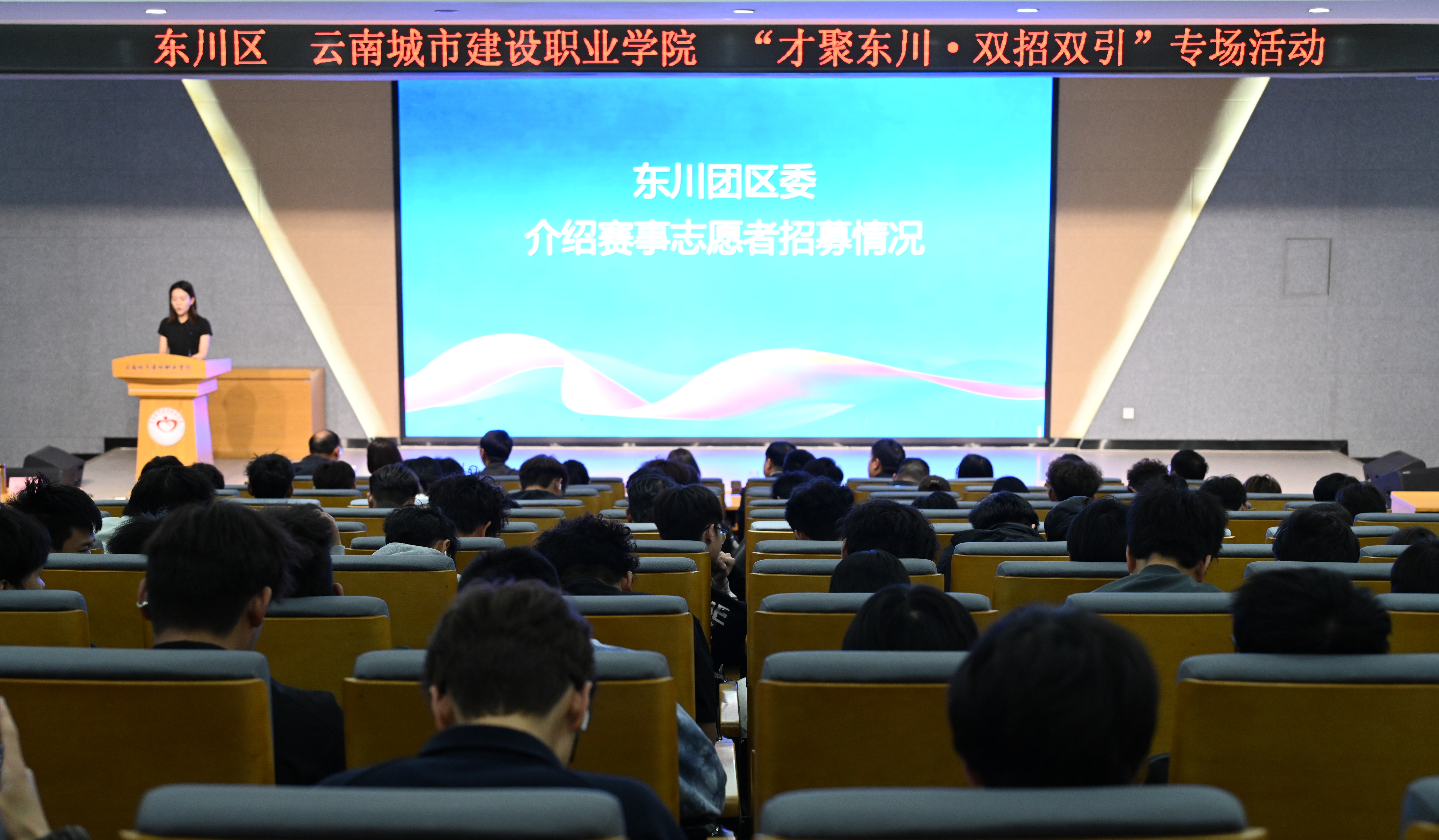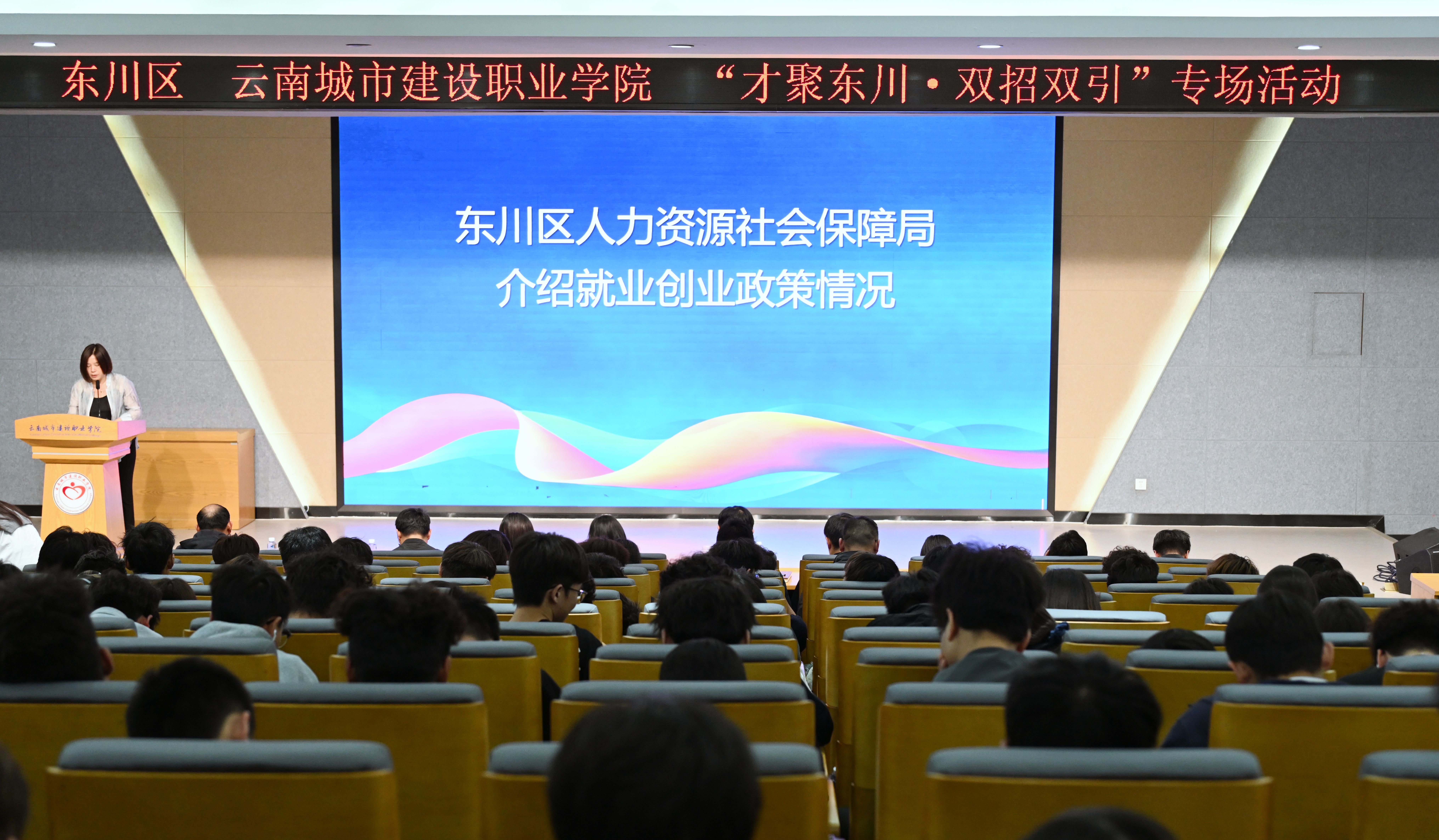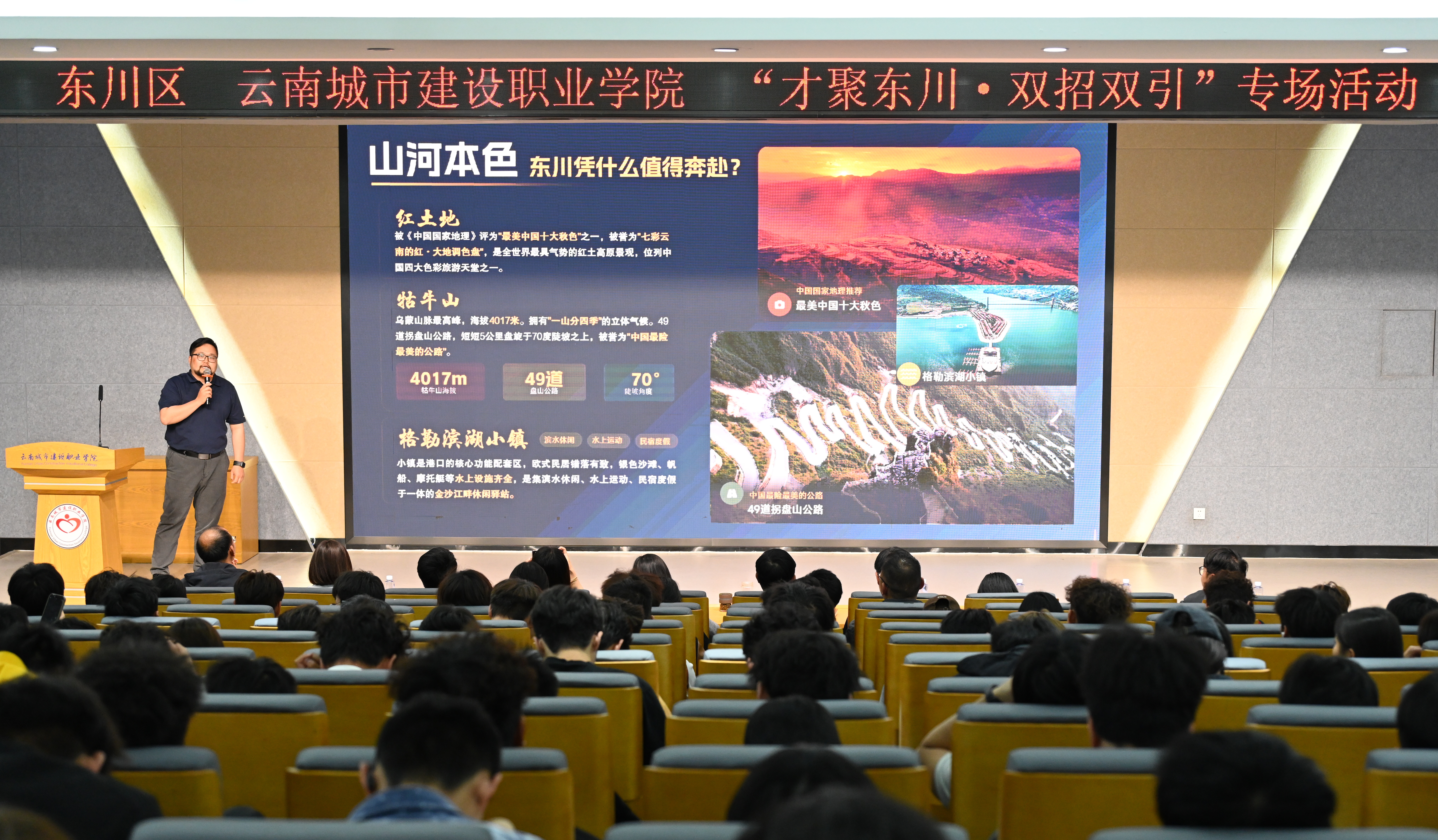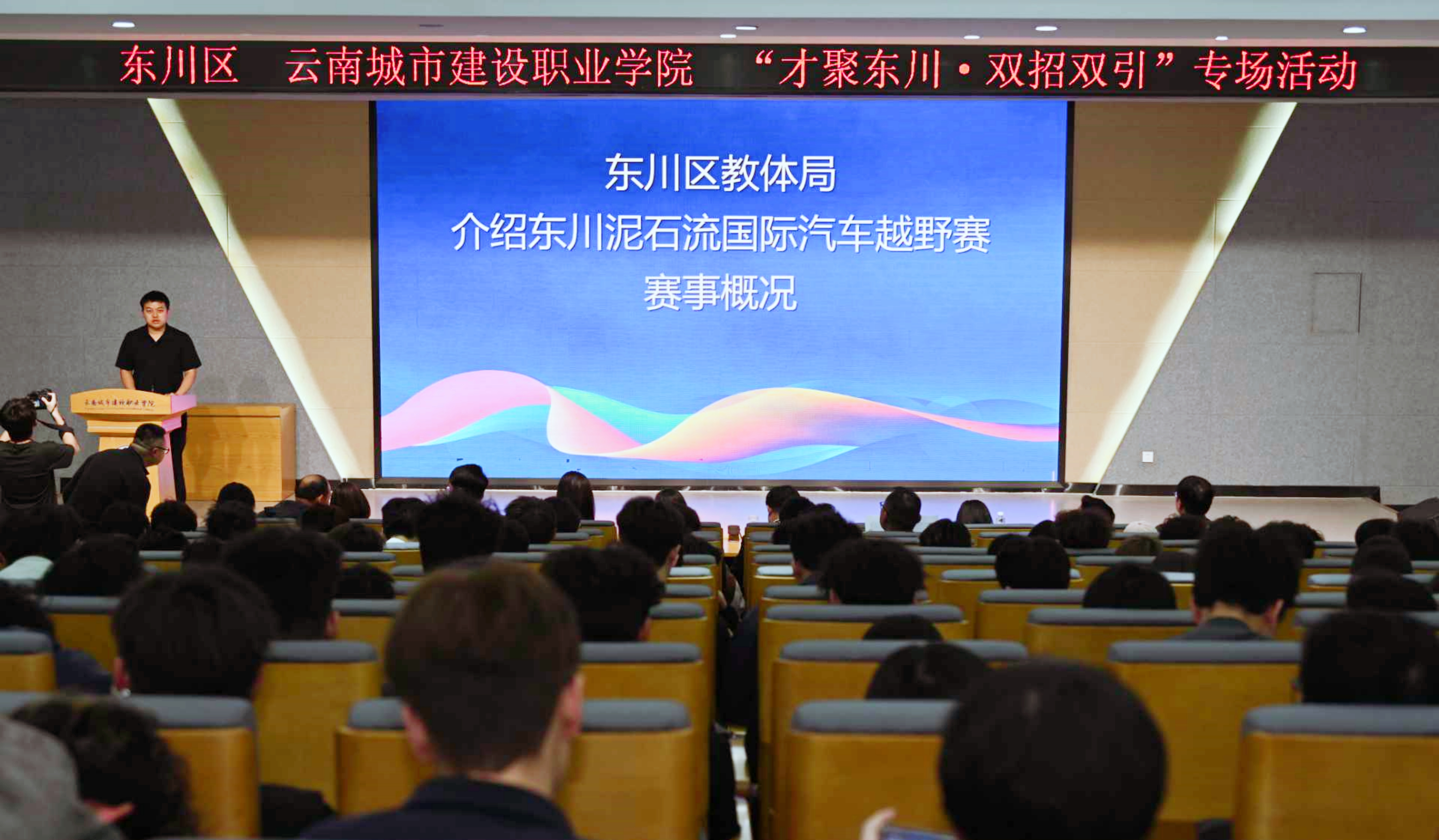 与会人员共同观看东川泥石流国际汽车越野赛专题宣传片,直观感受东川独特的城市魅力与品牌赛事活力。东川区委人才办、区教育体育局、区人力资源社会保障局、团区委、文旅投等分别就东川区情与人才情况、东川泥石流国际汽车越野赛赛事概况、就业创业扶持政策、赛事志愿者招募信息、特色文旅项目等作了详细的宣传推介,为同学们提供清晰的就业方向与实践机会。