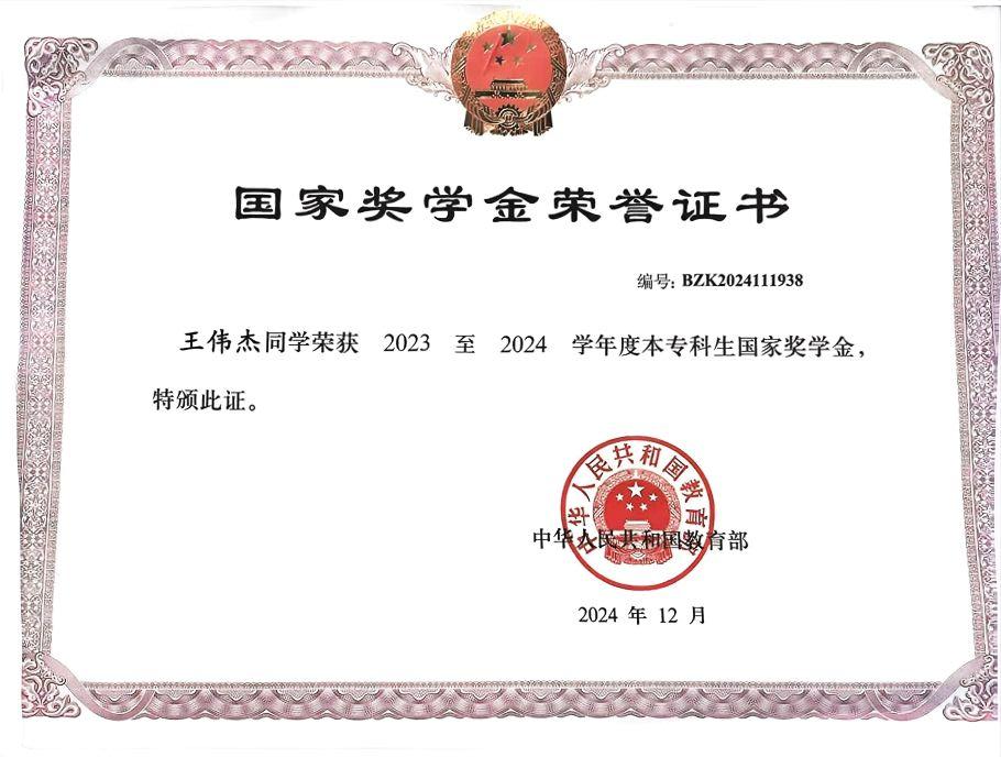 进入大学后,王伟杰将军人的优良作风有机融入学习生活。作为一名中共党员,他充分发挥先锋模范作用,踏实勤奋。他成绩优异,学习能力与自律性较强,认真钻研专业知识,学习目标明确并从不松懈。他担任学院团总支副书记期间,策划组织三十余场校院级活动,累计参与公益超200小时。凭借在学业与服务方面的优异表现,曾先后获得国家奖学金、省级“三好学生”“优秀毕业生”等荣誉。