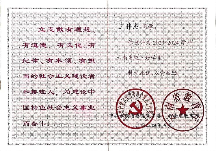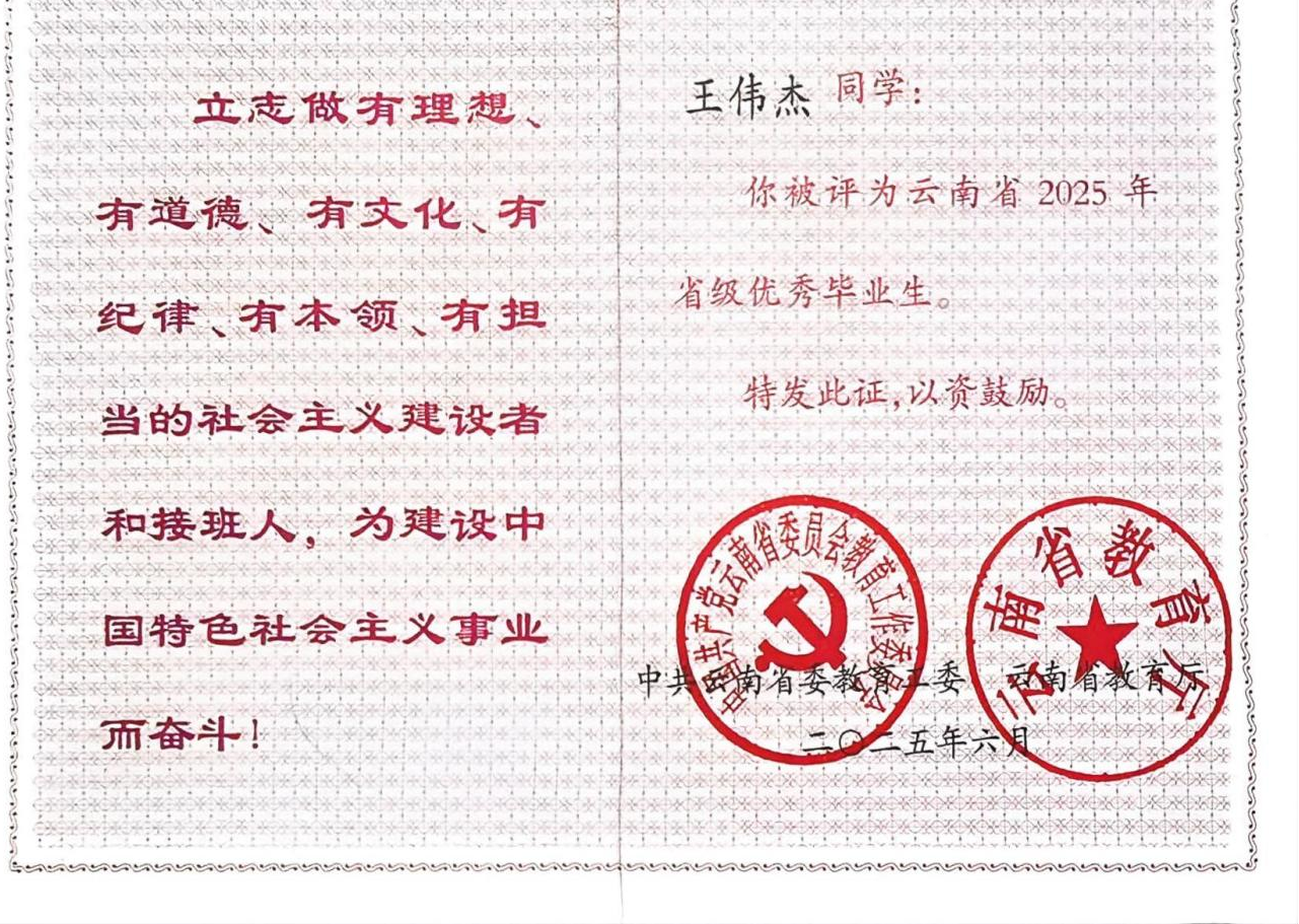 王伟杰,中共党员,拥有五年军旅生活经历。2024年毕业于学校大数据与会计专业,毕业后凭借扎实学识及科学方法成功通过专升本考试,考入云南民族大学,开启本科阶段的学习生涯。