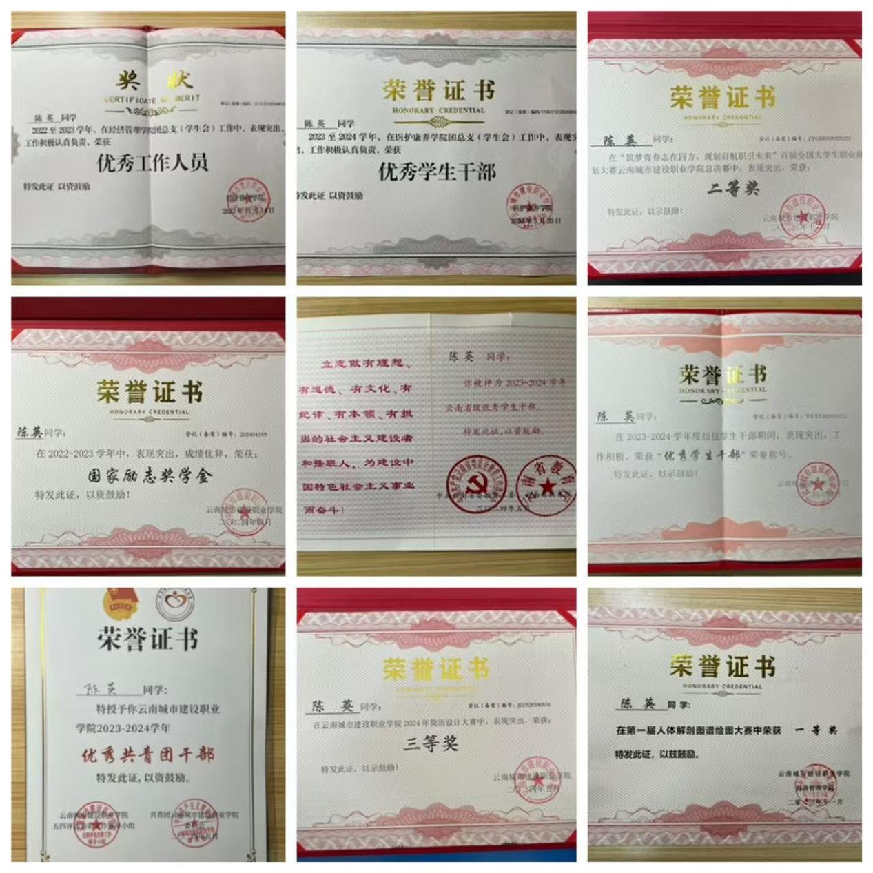 在校期间,陈英同学刻苦努力,一直把学习当作自己的第一要务,努力提升专业素养,学习成绩和综合素质测评名列前茅,并先后荣获国家奖学金、国家励志奖学金等荣誉。作为学生干部,她具有极强的集体荣誉感和责任感,在各项工作中率先垂范、以身作则,用自己的实际行动帮助和服务同学。同时,她积极参加各类活动和技能竞赛,先后荣获国家级、省级与校(院)级各类荣誉50余项,在同学们中充分发挥榜样模范作用。