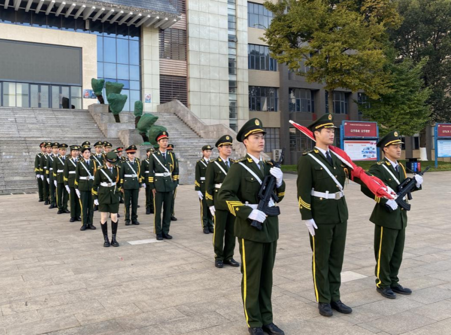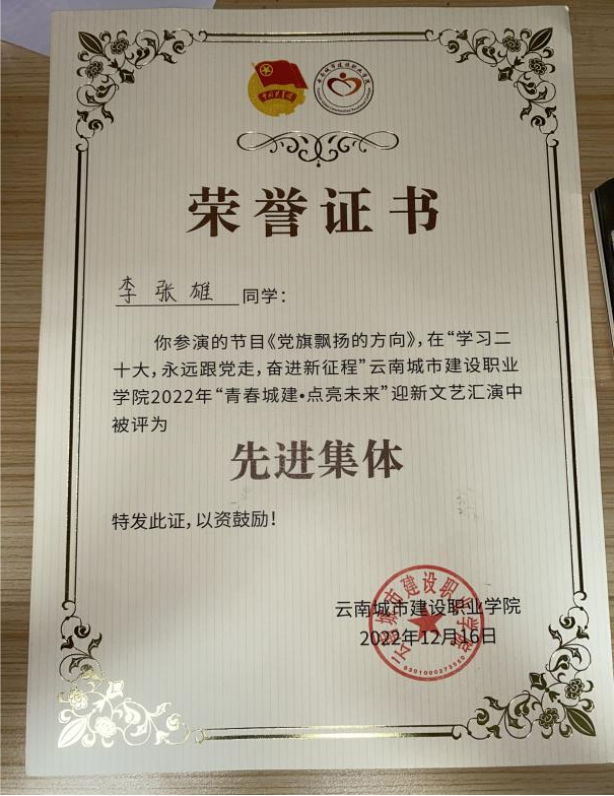 在校期间,李张雄在扎实学习专业知识的同时,也积极参与各类校园文化活动。作为学校国旗护卫队的一员,他始终以严格的标准要求自己,刻苦训练,认真完成每一次的护旗、升旗任务,在实践中深化对责任的理解。同时,他还积极参与志愿服务,在校园环境维护、新生入学引导等活动中贡献自己的力量,先后获得“优秀志愿者””军训优秀学员“等十余项荣誉。