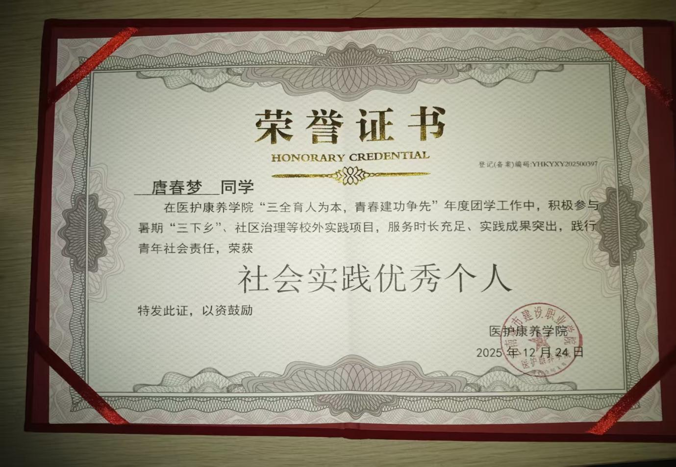 唐春梦积极参与校园文化建设与各类专业赛事,荣获“破茧而出・重‘新’启航”校园心理情景剧大赛“优秀奖”、“传承历史薪火,心承万里征程”知识竞赛“优秀奖”、“10·10”世界精神卫生日心理主题手抄报比赛“三等奖”、全国第三届大学生职业规划大赛“三等奖”。