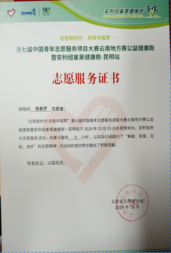 唐春梦始终坚持“知行合一”,主动走出课堂,将所学知识转化为服务群众、奉献社会的实际行动。她积极参与学校“三下乡”社会实践、第七届中国青年志愿服务项目大赛云南地方赛公益健康跑、寒暑假社会实践等多项志愿服务,志愿服务时长超过120小时,获评“社会实践优秀个人”。