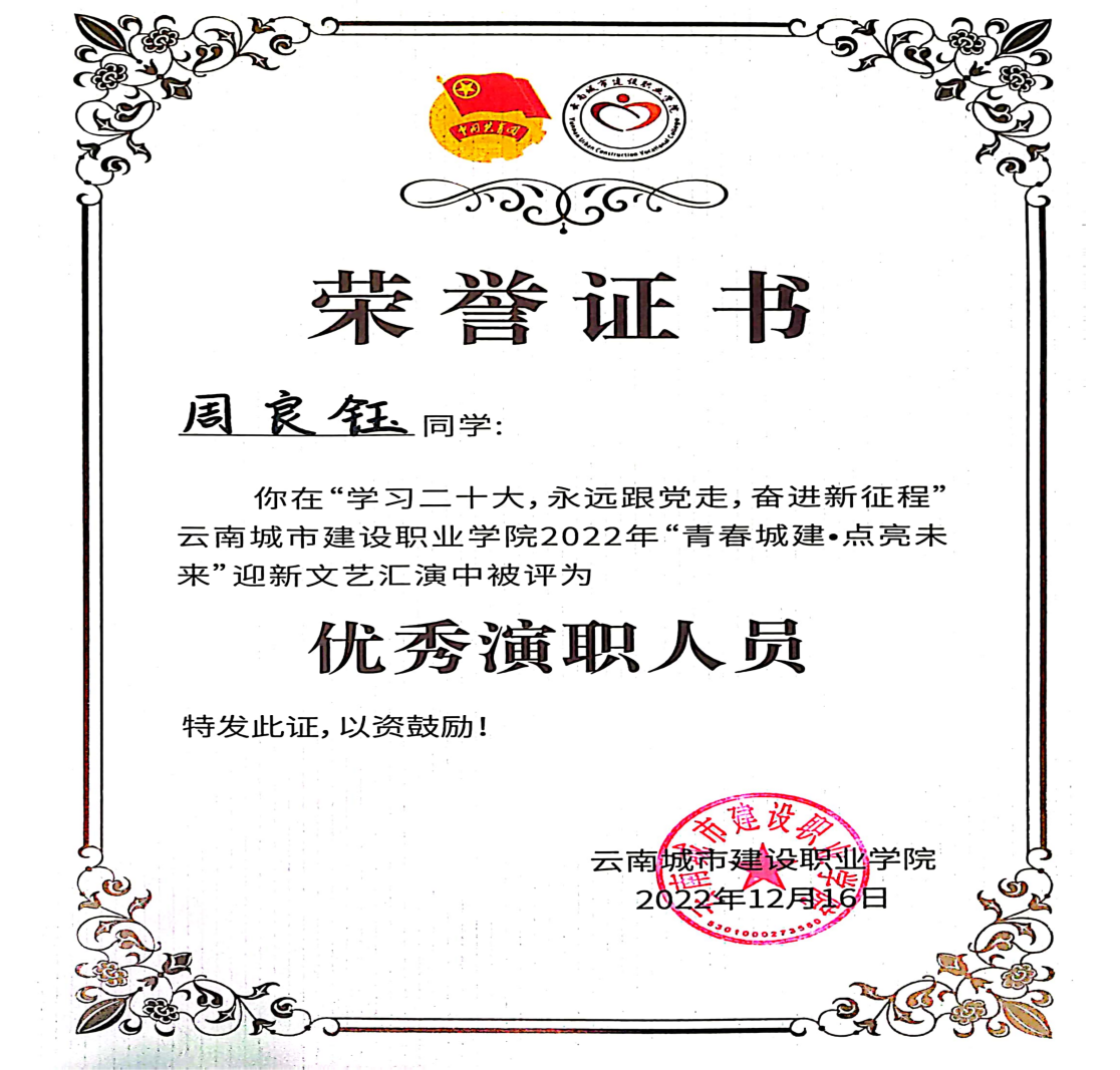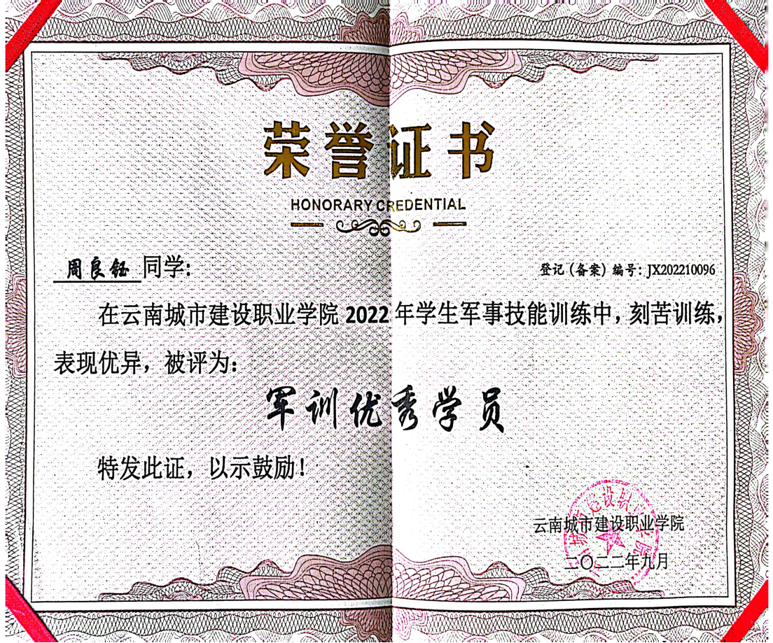 在校期间,周良钰始终以高标准要求自己,学习刻苦认真,专业知识测评成绩优异,连续两年荣获“国家励志奖学金”。担任学生干部期间,他积极履职、勇于担当,积极参与组织学校第三次学生代表大会、“国旗下的团结进步教育” 宣讲等各类活动,多次获评 “优秀学生干部”和“优秀共青团干部”等荣誉称号。